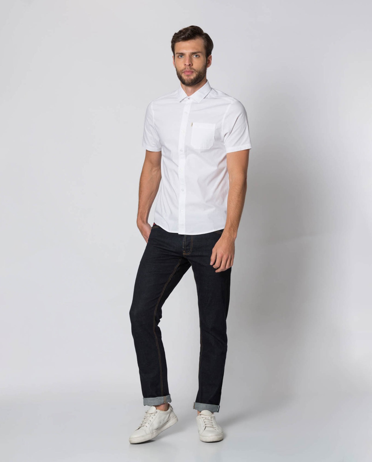 Camisa de hombre, corte ajustado. Propuesta con manga corta con cuello tradicional, perilla completa de botones y bolsillo cuadrado. Elaborada en algodón con elastano que le proporciona mayor comodidad a la prenda. Esta es una alternativa clásica inflable en el fondo del armario. Por su silueta, ajustada y ligeramente corta, es perfecta para llevar por fuera del pantalón.